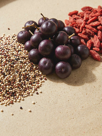 Hrachový proteinový izolát 40%, rýžový protein 33%, L-glutamin, nízkotučný kakaový prášek, látka zvýrazňující chuť a vůni (glycin a jeho sodná sůl), L-arginin, emulgátor: lecitiny (sója), quinoa mouka 1,6%, zahusťovadly (karagenan, celulosová guma), aromata, goji bobule prášek 1,1%, acai bobule prášek 0,6%, potravinářská sůl, sladidlo (sukralóza).